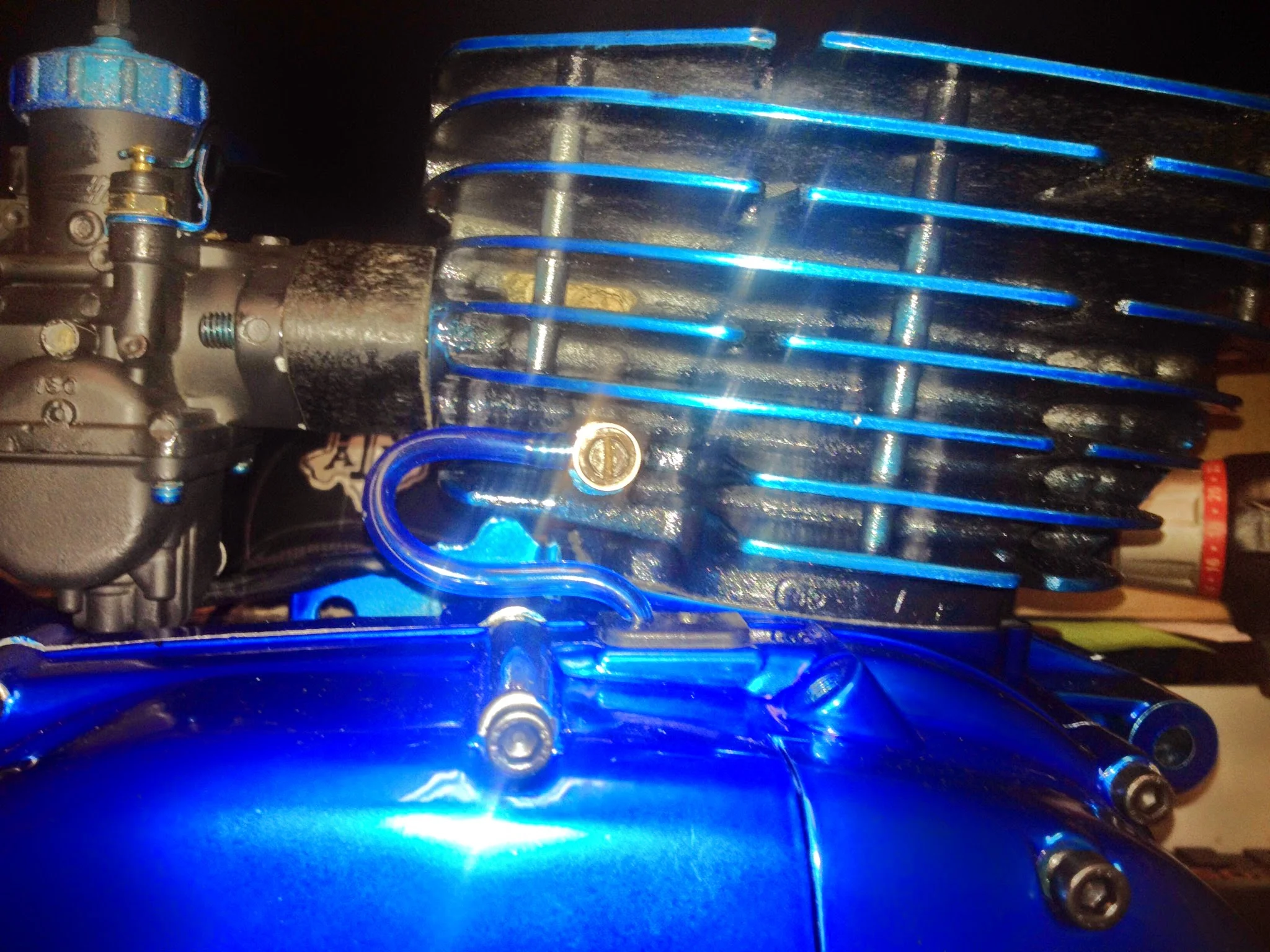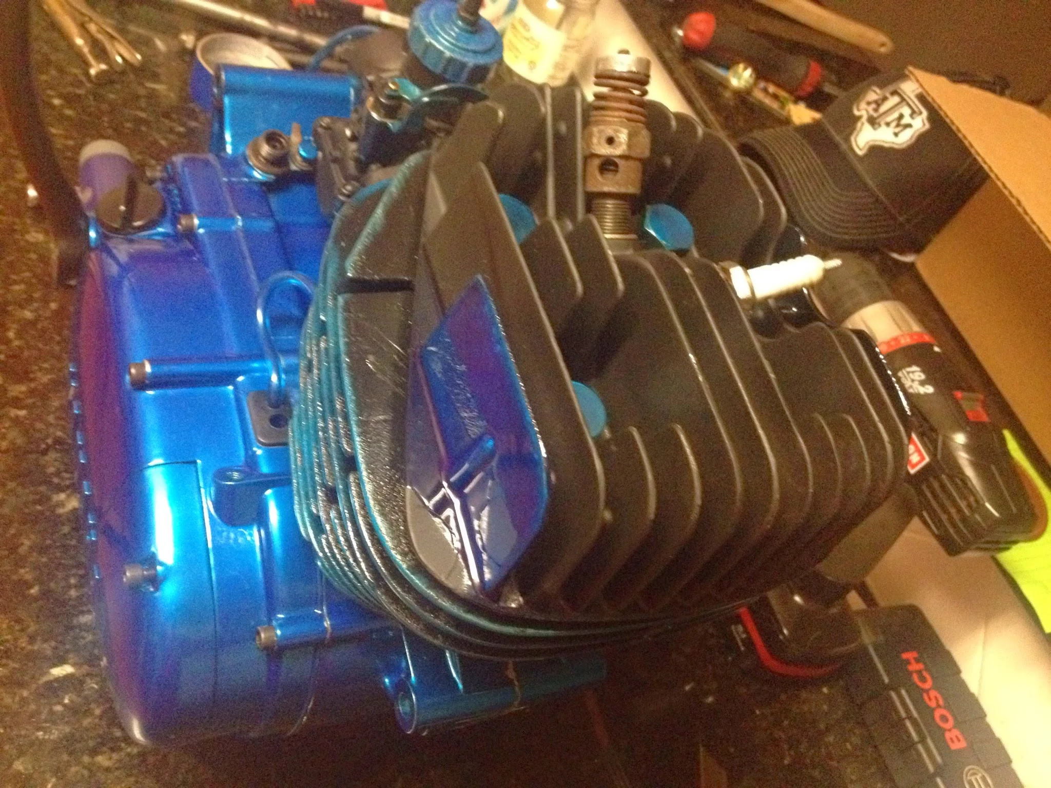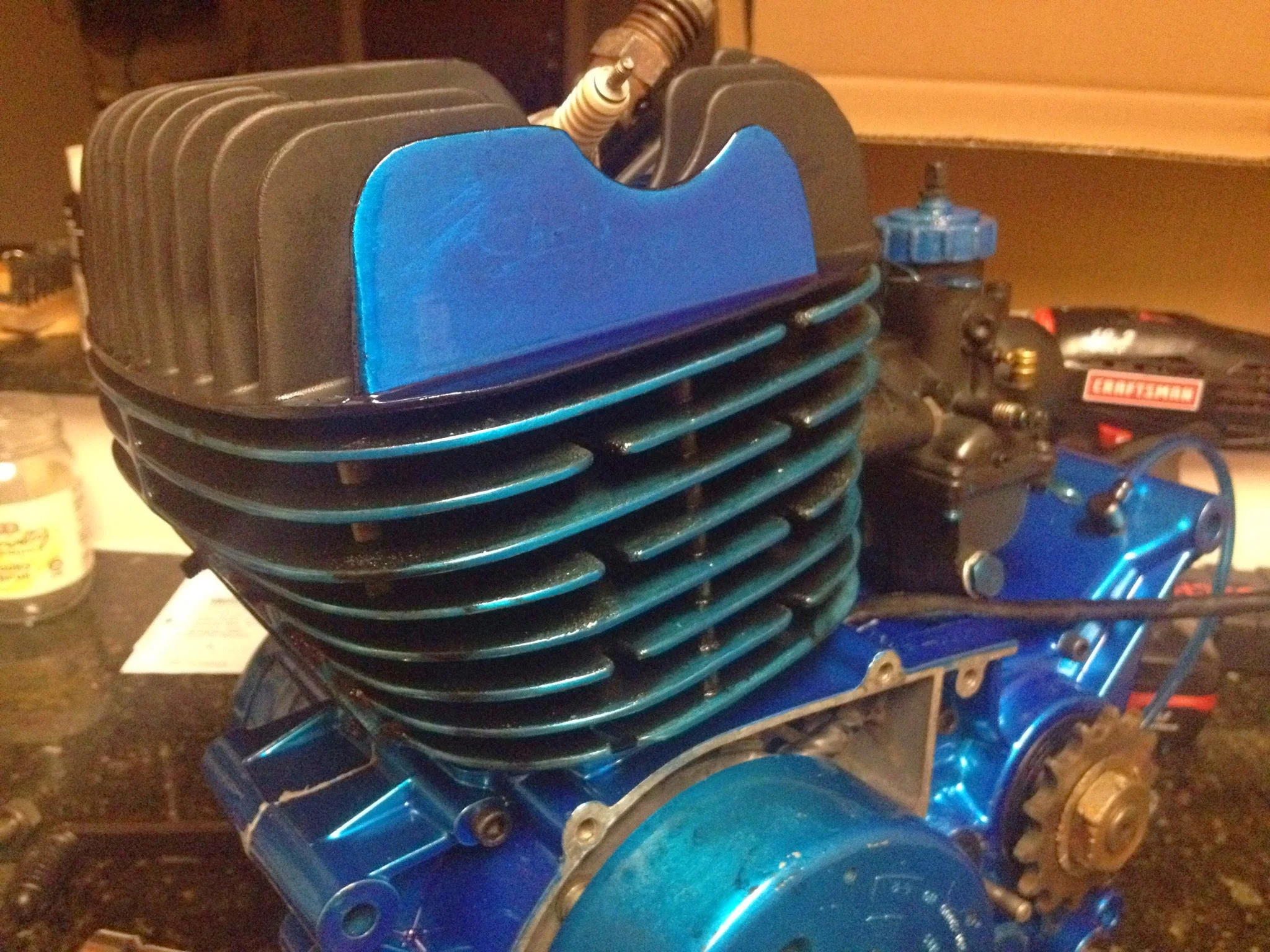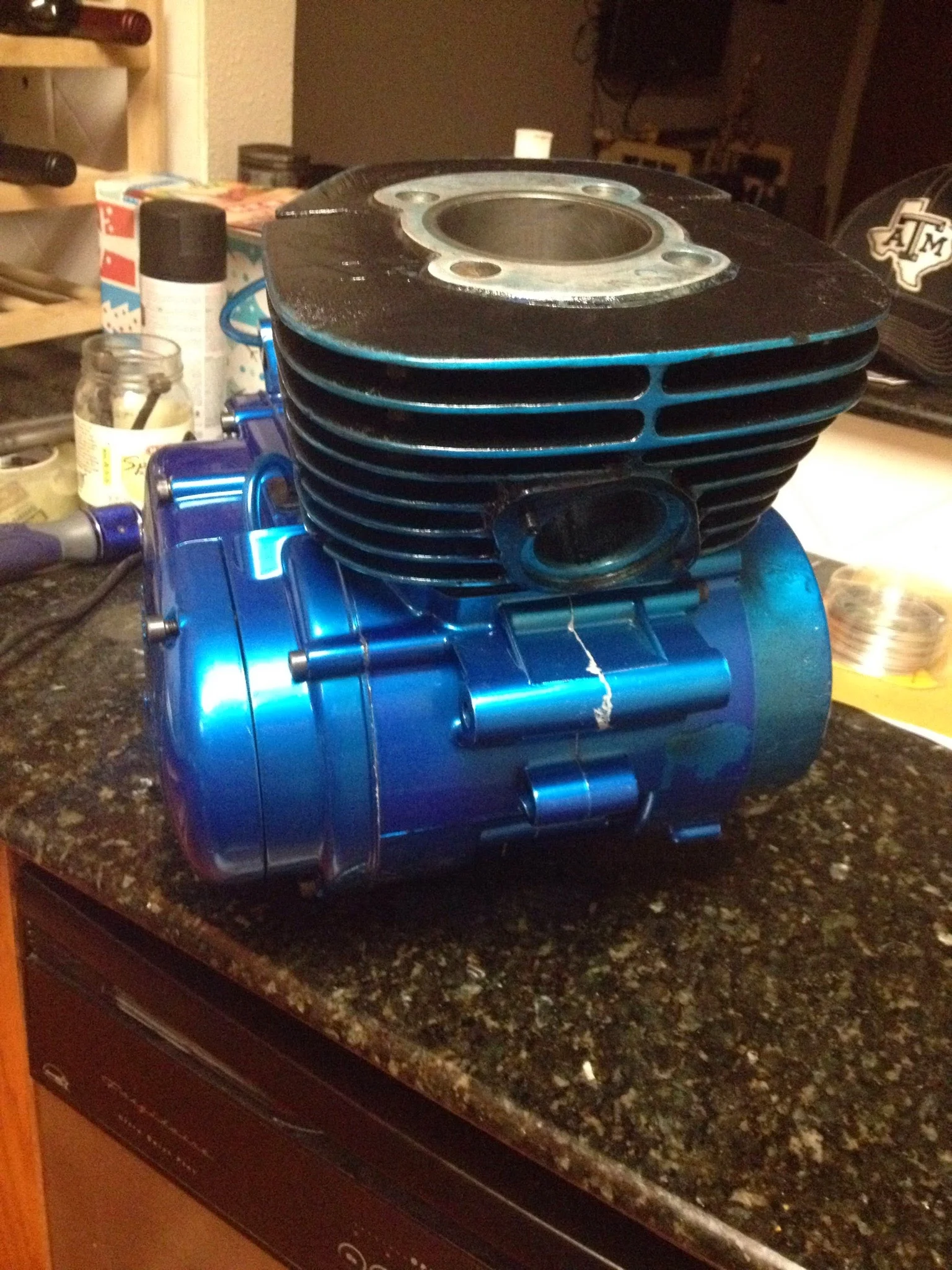 After it all cooled, I put the side covers on the engine, heated the whole thing up, took it outside, sprayed a last layer of blue on it, and baked it.