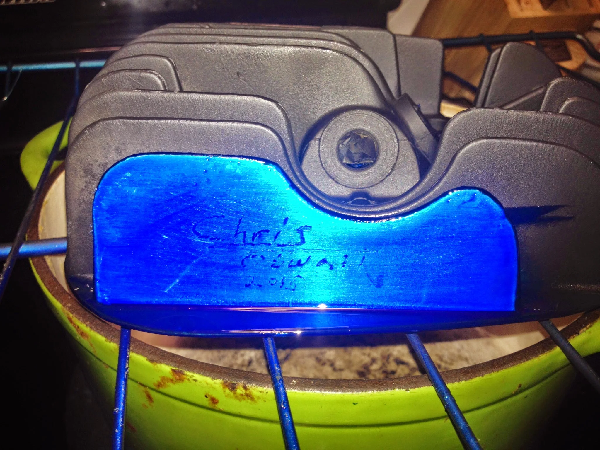 Letting the chrome layer cool is a tricky proposition. The blue will not adhere to a chrome-coated part. I’m thinking this is because of some metallic properties of the chrome powder. The top coat will only stick when the chromed part is hot enough to promote adhesion. Powder the top coat when the chrome is too hot- it’ll clump and glue itself together. Let the chrome cool too much- the blue won’t stick at all no matter what.